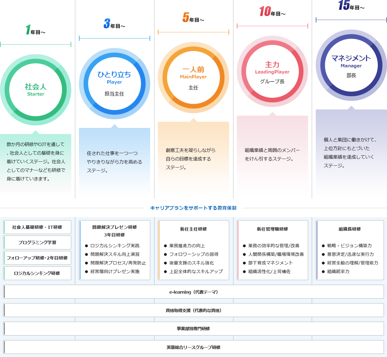 入社時の研修だけではなく、年次別、その人の成長に合わせて段階的に成長していけるような教育プログラムを用意し、