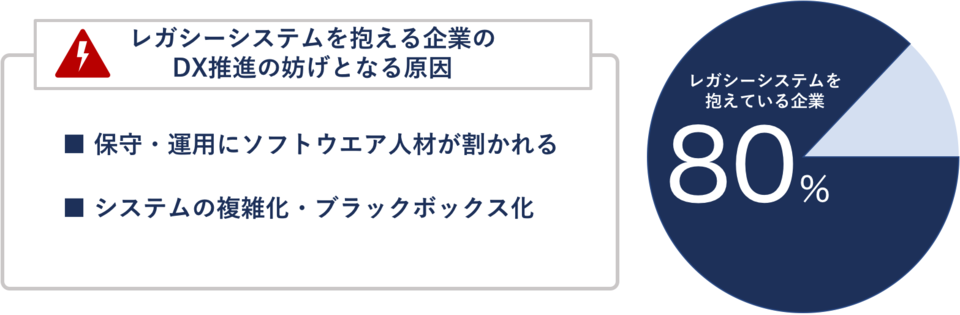 DXを行うためには、レガシーシステムを刷新しなければなりません。これに対して、中小企業ではシステムに専任できる人材が限られるため、対応が難しいことが課題となっています。また、大企業でもシステム開発に関わっていた人材の退職、異動、組織再編等で、当時を知る人がいなくなり、システムの老朽化・複雑化やブラックボックス化を招いています。
