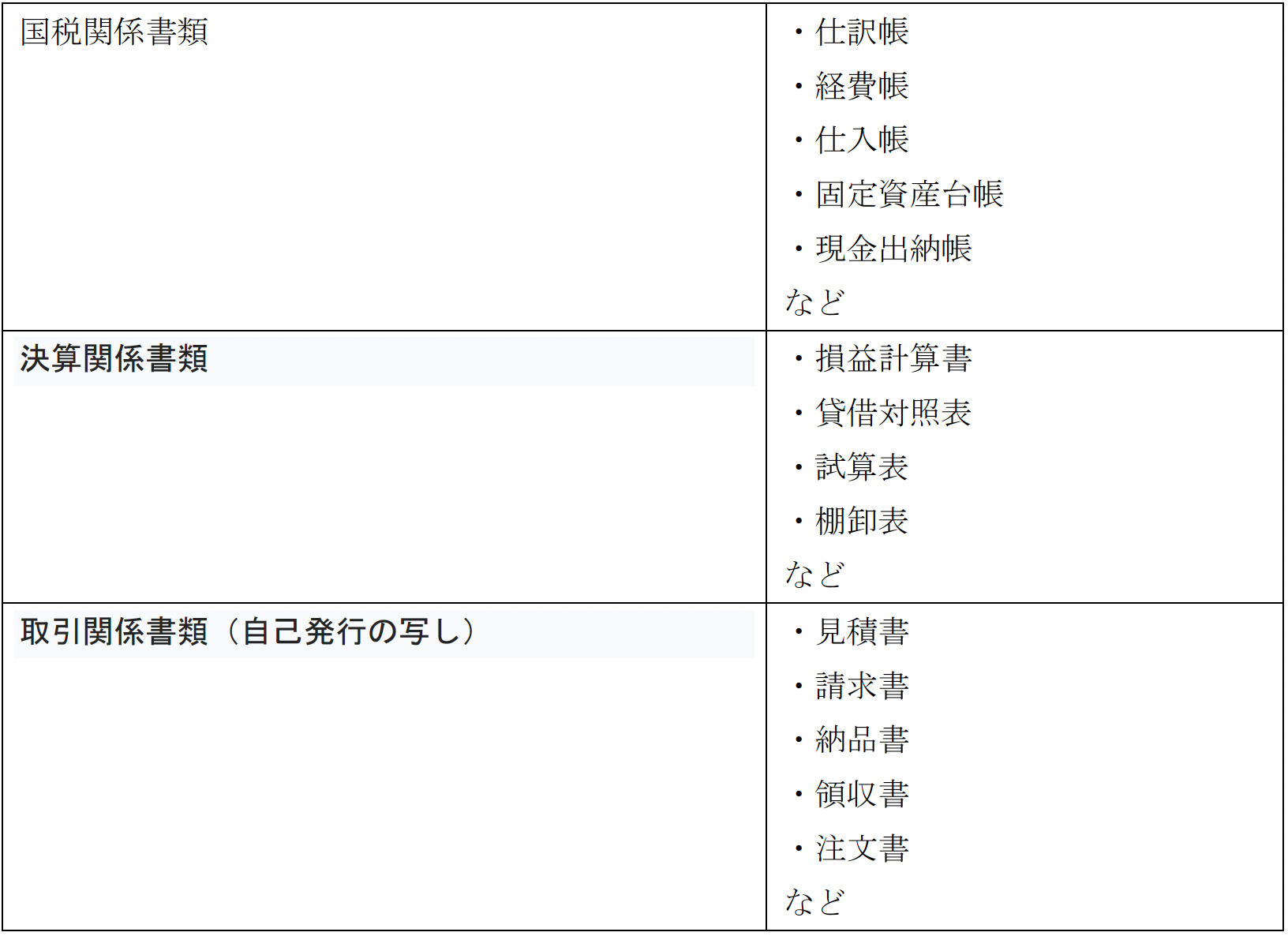 対象となる書類は「国税関係書類」「決算関係書類」「「取引関係書類(自社発行の写し)」の3種類で、それぞれに関係書類をご紹介します。