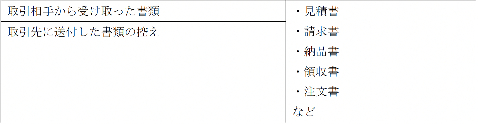 対象となる書類は「取引相手から受け取った書類」と「取引先に送付した書類の控え」の2種類あります。