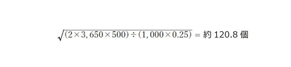 例えば前項で考えた商品Aを1年間で考えると、需要量3,650個、調達費用1回500円、単価1,000円で在庫保管比率は25%であれば、下記の式により約120.8個となります。