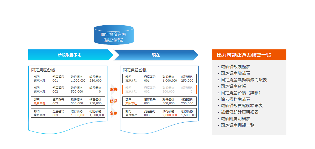 過去年月を指定することで、その時点の固定資産情報(簿価)が帳票出力可能です。いつでも過去時点の固定資産情報が確認可能なため、監査のときにもスムーズな対応が行えます。