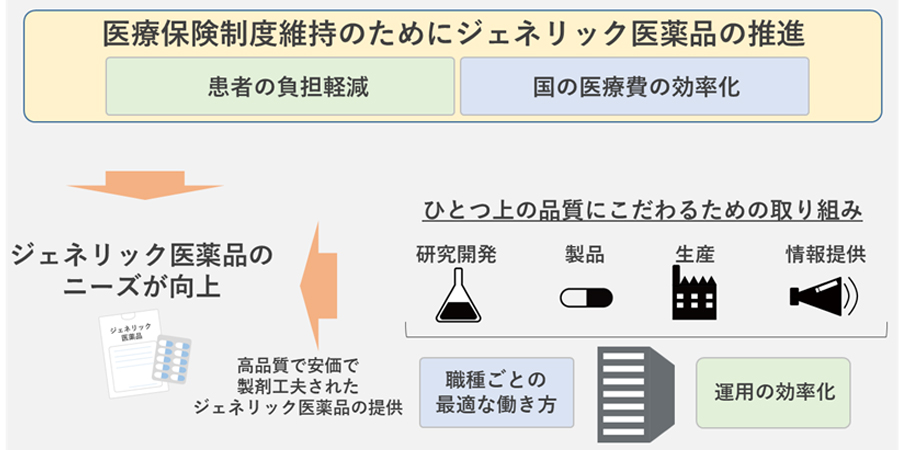 ジェネリック医薬品の使用は、患者さんの自己負担を軽減するとともに、国の医療費を効率化し、現在の医療保険制度を維持するものとして推進されています。 超高齢化社会を迎える日本のみならず、世界中で高品質かつ安価で製剤工夫されたジェネリック医薬品のニーズが高まっています。
