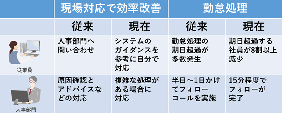 働きやすい環境づくりという点では、交替勤務、時差出勤、フレックス勤務、みなし労働など職種や拠点ごとに異なる複雑な勤務形態にも柔軟に対応し、各々がパフォーマンスを発揮しやすくなったことで効果が出ています。