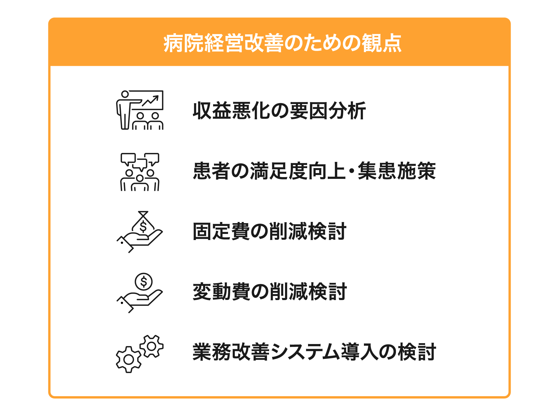 病院の経営改善の進め方について、以下の5つの観点から解説します。
