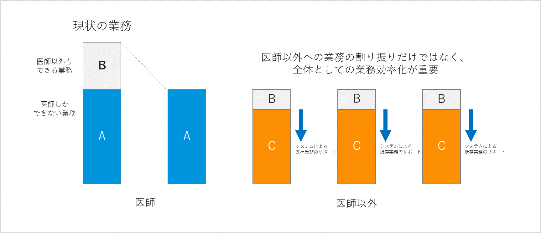 ただ、医師の業務負荷を調整した結果、他の方の業務負荷が増して健全な経営を損なっても本末転倒ですので、院内全体で効率化をはかるためにはシステムの導入を含めた生産性向上を考える必要があります。