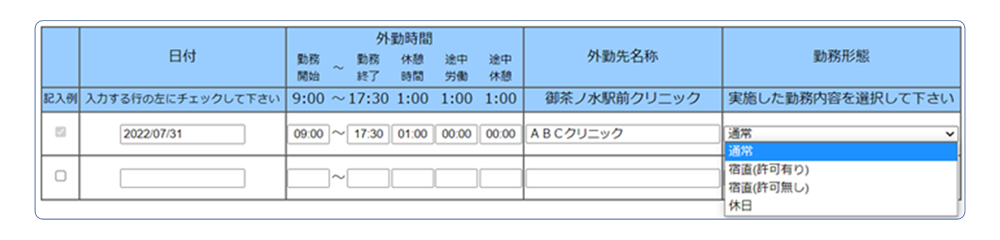 他病院での労働時間(外勤)を日に2回申請が行えます。